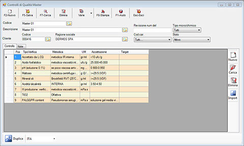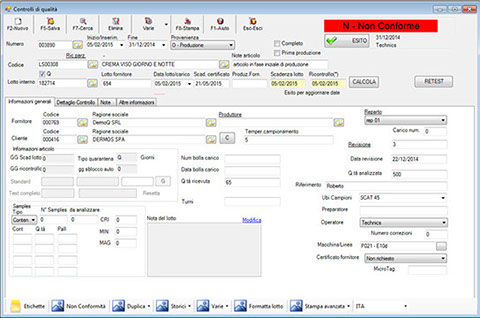 Gestione dei controlli qualità per ingresso merce, produzione, prove di laboratorio, ricontrolli articoli, personalizzazione della gestione quarantena, utilità per duplicazione e confronto specifiche prodotti ed analisi effettuate, specifiche chimiche e microbiologiche, sanitizzazioni.Controllo su esitie risultati fuori specifica. Viene gestito il rilascio del lotto con l’acquisizione automatica d tutte le informazioni relative ai componenti utilizzati.