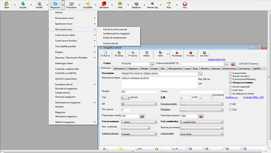 L' anagrafica articoli mette a disposizione dell'operatore una grande quantità di informazioni. Per fornirne appena qualche esempio, sarà dato modo di distinguere tra fornitore abituale e fornitori alternativi (ivi compresi i relativi giorni di consegna e i costi d'acquisto), le informazioni sui lotti minimi e i lead times, gli articoli alternativi ( segnalati in produzione) e molto altro ancora.